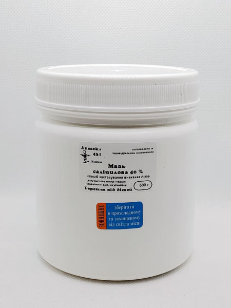 - кислота саліцилова 40% є протимікробним, протизапальним засобом з підсушуючим ефектом, покращує трофіку, пригнічує секрецію сальних залоз, сприяє видаленню кірок і лусочок.